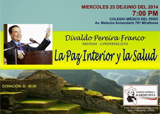 Miraflores – Divaldo P. Franco estará no dia 25 de junho de 2014, às 19h, no Colégio Médico del Perú – Av. Malecón Armendariz 791 Miraflores, abordando o tema “La Paz Interior y la Salud”.